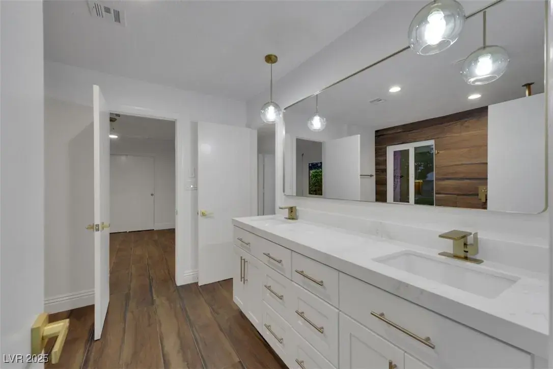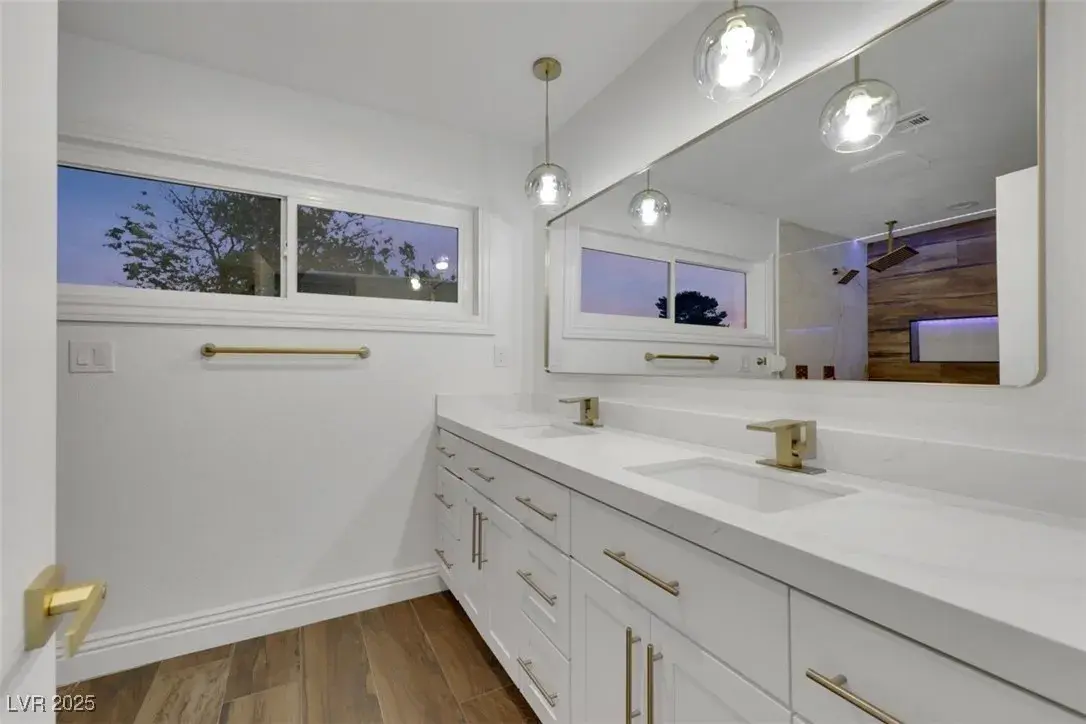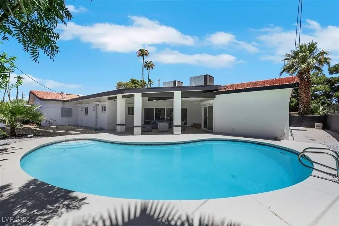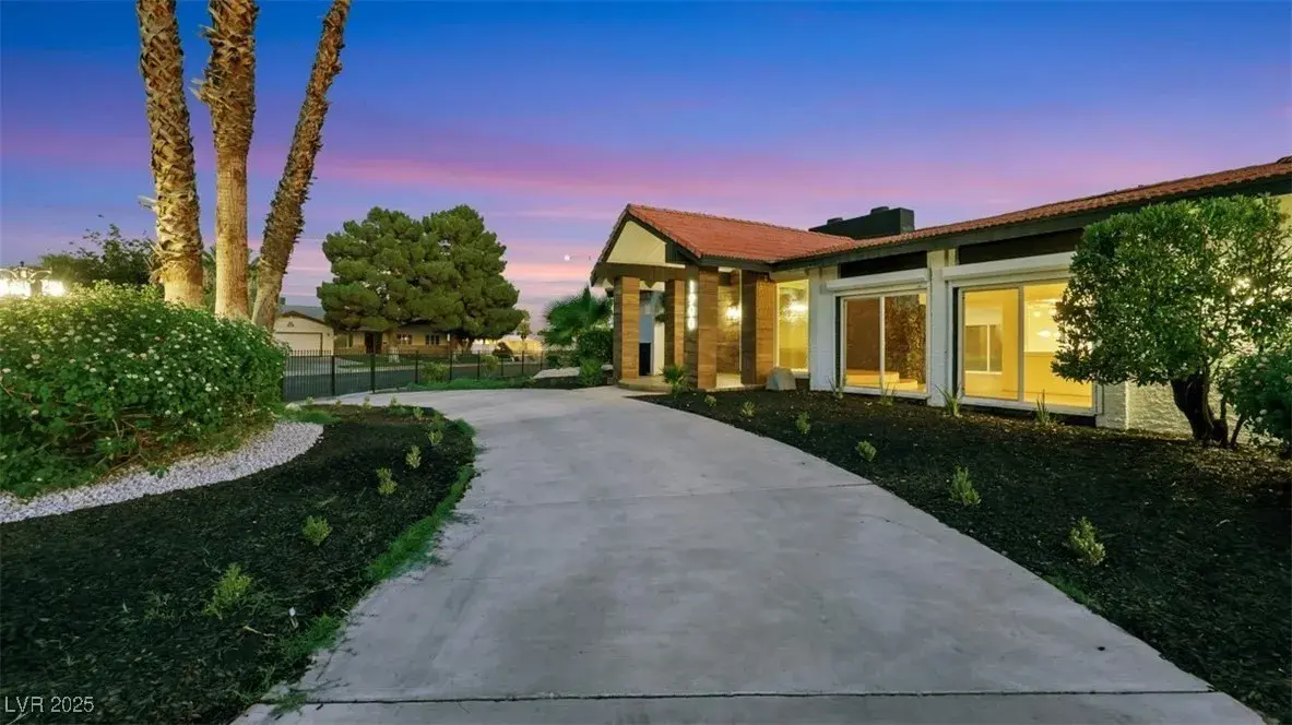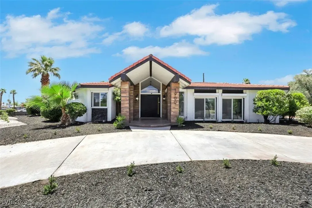 STUNNING!! One of a kind luxury designer all new home with amazing curb appeal with circle drive and pool. Incredible kitchen with 4 ovens! CHEFS DREAM! Private on big corner lot in high demand historical district close to the Strip. Mid century modern with rich beautiful wood look tile fl oors inside and outside on both patios, new black pivot front door, full 16 slider along back to pool, ALL NEW cabinets, ALL white Carrara quartz, high end white GE Cafe appliances, 3 all new designer showers, exquisite lighting and fans throughout, lava stone wall for fireplace with seat, champagne bronze accessories, 2 islands with waterfall quartz side, full white quartz matching backsplash, new landscaping with full drip line system, new plumbing, new electrical, new gold faucets and sinks! 4 full bedrooms and formal office. Huge family room and living room. Huge walk in pantry with prep counters! 4 ovens! Chefs DREAM! NO HOA! Historical Vegas features preserved!! House is just like NEW!